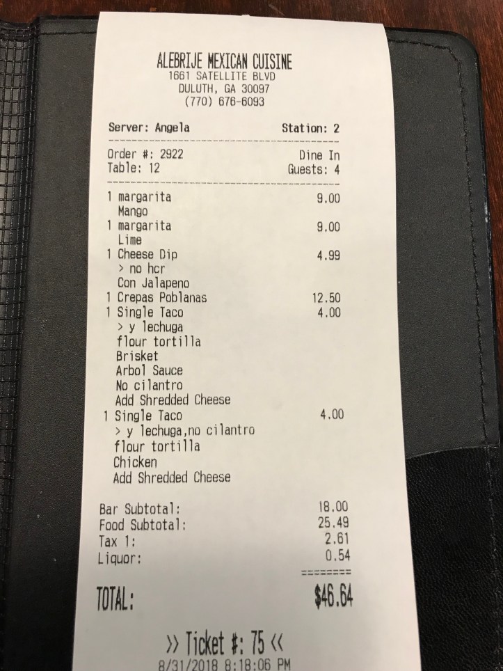 November 17, 2018October 20, 2018 McGuido Alebrije: tacos (brisket and chicken) Chicken was ok The brisket was exquisite Share this: Share on X (Opens in new window) X Share on Facebook (Opens in new window) Facebook Share on LinkedIn (Opens in new window) LinkedIn Share on Tumblr (Opens in new window) Tumblr Like Loading... Related
