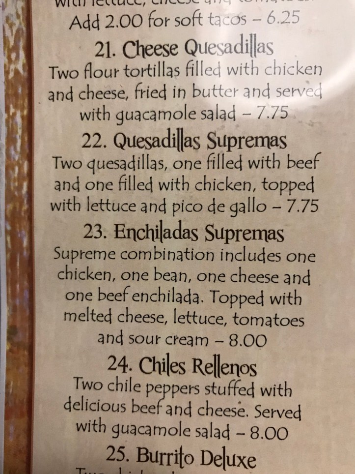 February 7, 2019January 19, 2019 McGuido El Carrizo: enchiladas supremas Columbus, Ga It was good. All of it. Chicken, beef, bean, cheese…good. Share this: Share on X (Opens in new window) X Share on Facebook (Opens in new window) Facebook Share on LinkedIn (Opens in new window) LinkedIn Share on Tumblr (Opens in new window) Tumblr Like Loading... Related