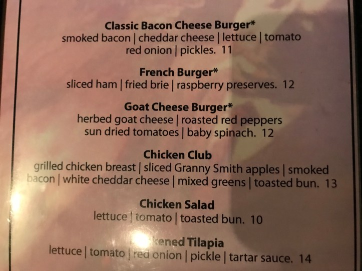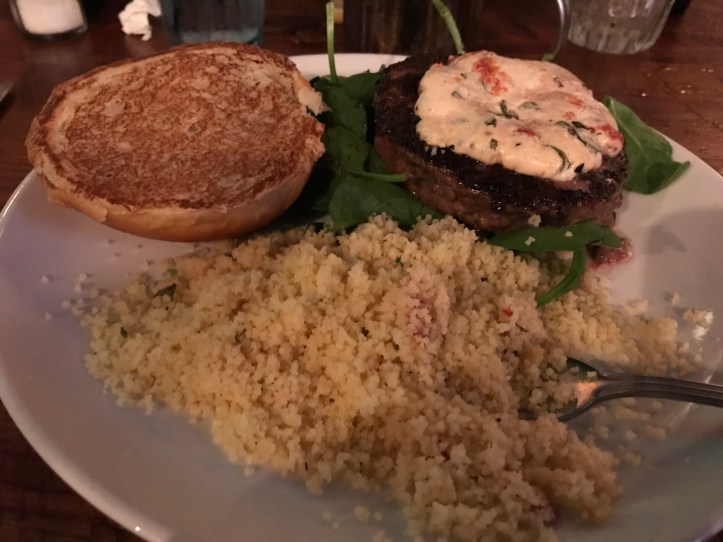 The burger: if you like goat cheese, this is definitely for you. If you have Any hesitation about goat cheese, stay away. When I described this to the wifey over the phone, she said everything on it was a Nope.