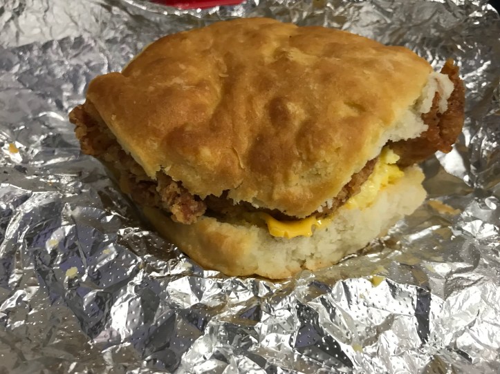 This time was a tiny bit of a letdown. Egg: good. Cheese: good. Biscuit: good. Chicken: a touch on the dry side. Lots of meat. The right amount of fried breading. Just a little dry. A teaspoon of grape jelly would have fixed that, but I didn’t have any handy.