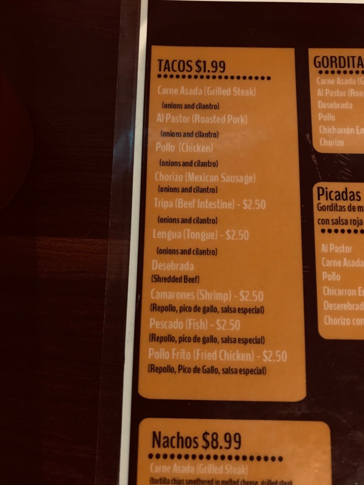 I had the desebrado (mild flavor but very very gooood), the al pastor (flavor bursting in your mouth, not too wet, not too dry, Goldilocks style), the pescado and the camarones I couldn’t tell apart while eating them, the pollo frito (skip it, flavor was terrific but the chicken was flattened to the point of non-existence and then Over fried).