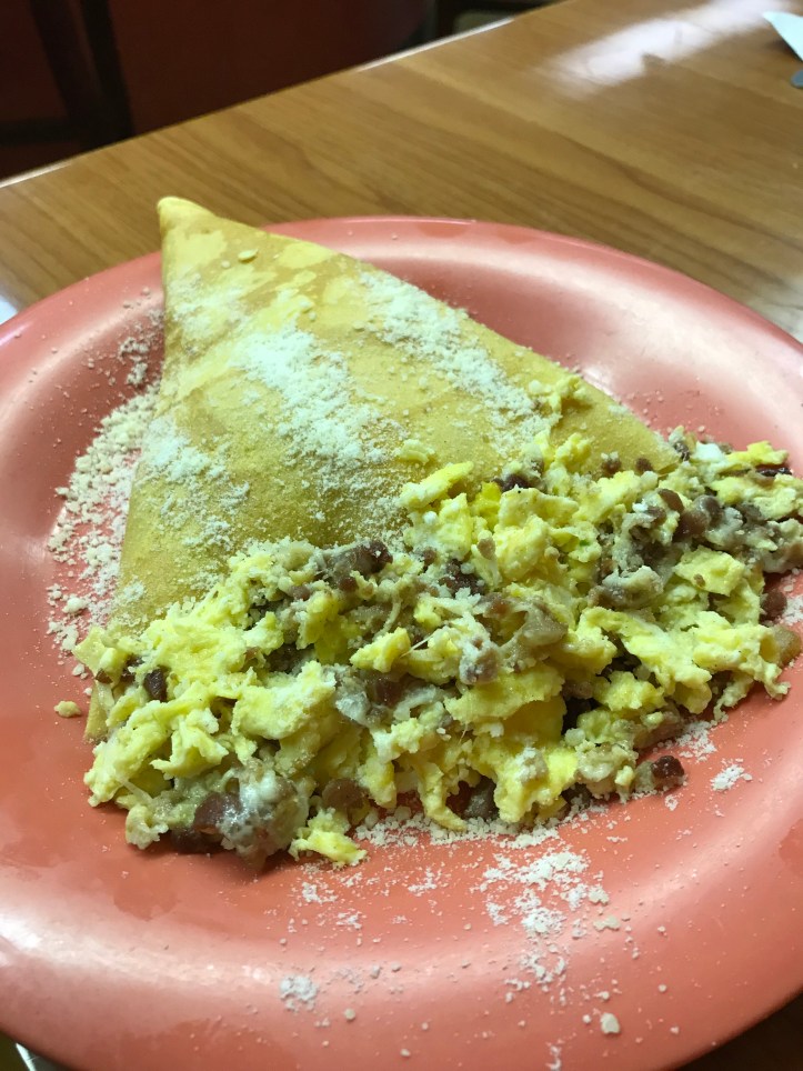 Savory crepes with eggs and bacon and pepper jack cheese.