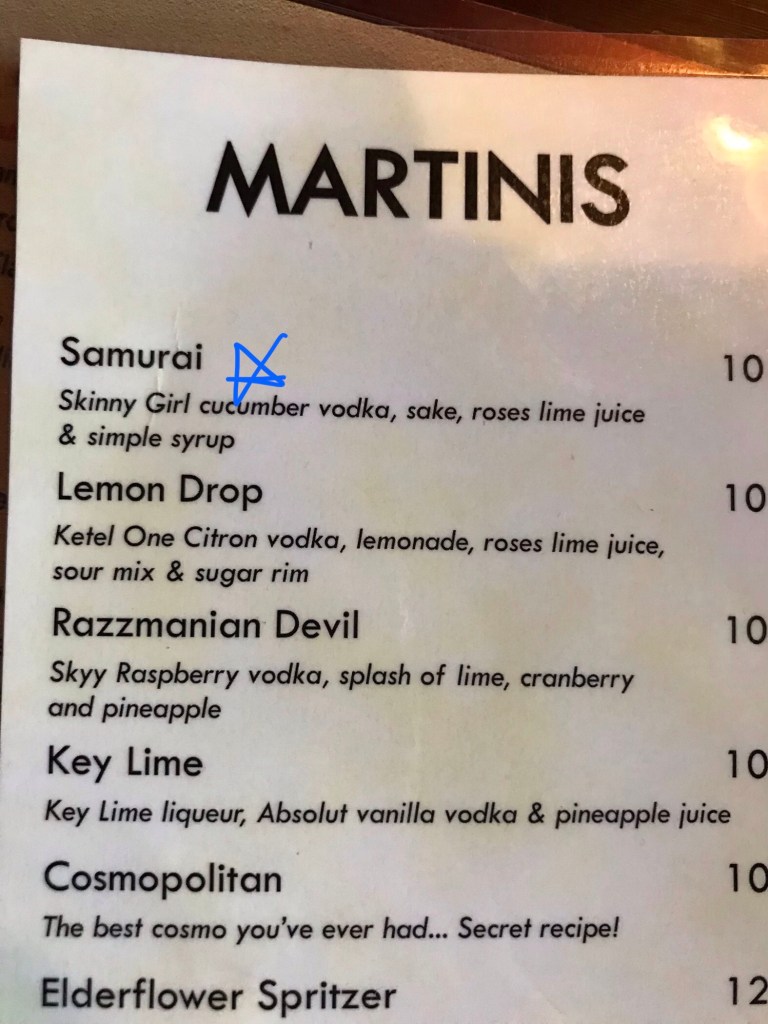Once again, the food was excellent, but I have to admit I was not a fan of the Samurai martini.